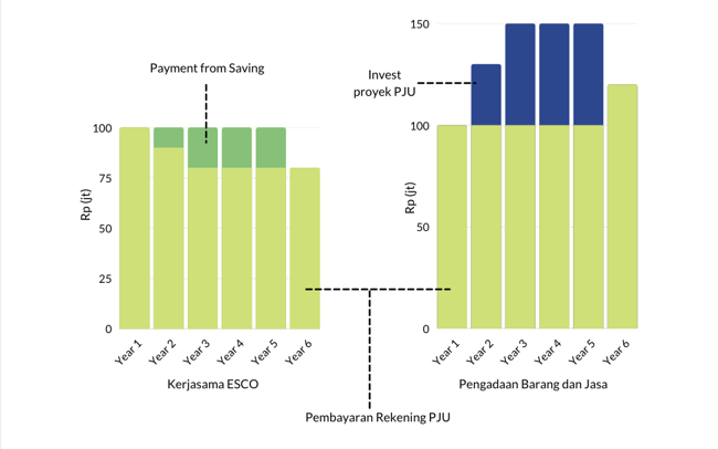 Dari uraian gambar di bawah, pemerintah daerah tidak mengeluarkan investasi (zero investment) untuk membiayai proyek efisiensi energi dan hanya membayar jasa ESCO setelah hasil evaluasi menunjukkan penurunan rekening dan penghematan energi melalui skema payment from saving.