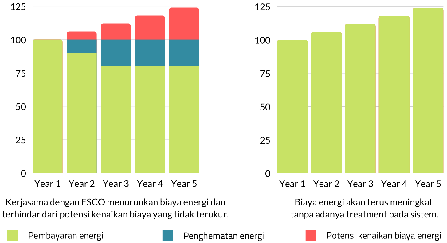 ESCO menjamin terjadinya penghematan sesuai yang dijanjikan selama masa kerjasama berlangsung.